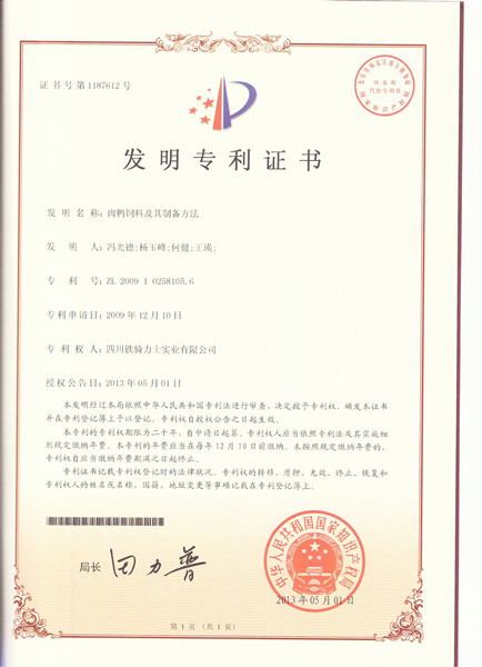 近日,铁骑力士集团申请的又一发明专利《肉鸭饲料及其制备方法》获得国家知识产权局正式授权,并颁发国家发明专利证书,专利号ZL200910258105.6。同时还获得《超声波探头固定卡尺以及超声波探头测量尺》、《乳头饮水器检查装卸工具》两项实用新型专利,专利号ZL201220574571.2和ZL201220575117.9。