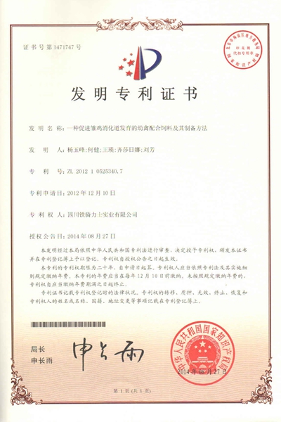 9月15日,由铁骑力士集团冯光德实验室申请的《一种促进雏鸡消化道发育的幼禽配合饲料及其制备方法》获得国家发明专利授权,专利号为ZL201210525340.7。这是集团今年以来获得的第3项发明专利。