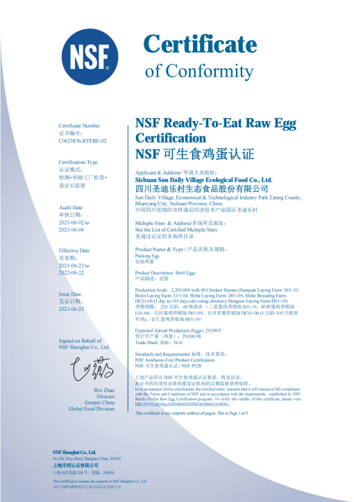 2021年,圣迪乐村成为国内唯一一家产量最大,同时获得NSF国际机构颁发“可生食鸡蛋认证”和“无抗生素认证”的蛋品企业。NSF是具有国际威望的第三方认证机构,一直致力于食品安全产品的认证和测试,也是世界卫生组织(WHO)在食品安全方面的指定合作中心,受检企业是必须经过严苛的检验才能获得认证的。圣迪乐成为国内唯一一家最大体量通过了该认证的企业,说明圣迪乐在产品安全、质检和诚信上的极致,将可生食和无抗生素作为圣迪乐颗颗鸡蛋的基础标准,这是圣迪乐的诚信壁垒。